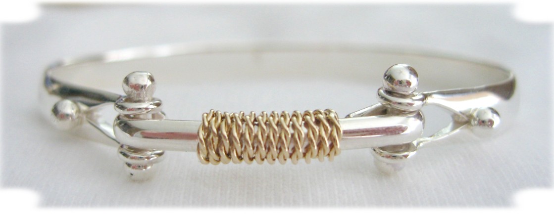 The Catch Bracelet is made in all sterling silver with Silver wrap on the top catch, or 10K gold wrap. It comes in 6mm band or 8mm band.The Catch Bracelet is a unisex bracelet. It has a hinged top so it slips on very easy at the wrist. *GOLD WRAP PICTURED- ADDITIONAL CHARGE**