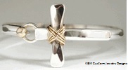 This beautiful cross bracelet is made in sterling silver and 10k gold. The rope around the cross and the ball catch is 10k gold. It comes in different sizes, please give us your exact wrist size.