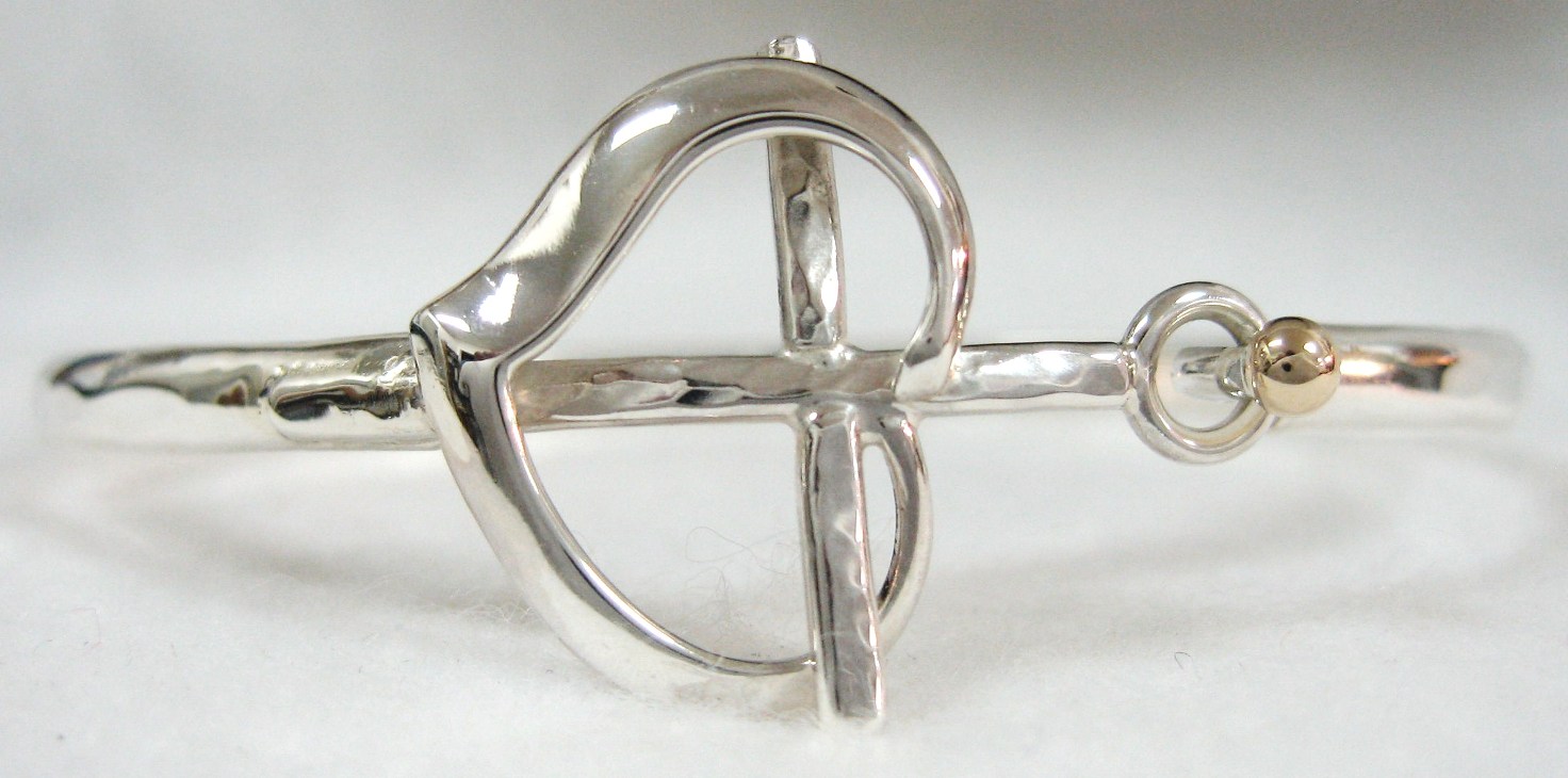 This beautiful sterling silver bracelet with the heart and cross makes a great gift for the woman in your life. It's all handmade on a solid band, with a small gold ball at the catch. They are made in different sizes, so give us your actual wrist size.